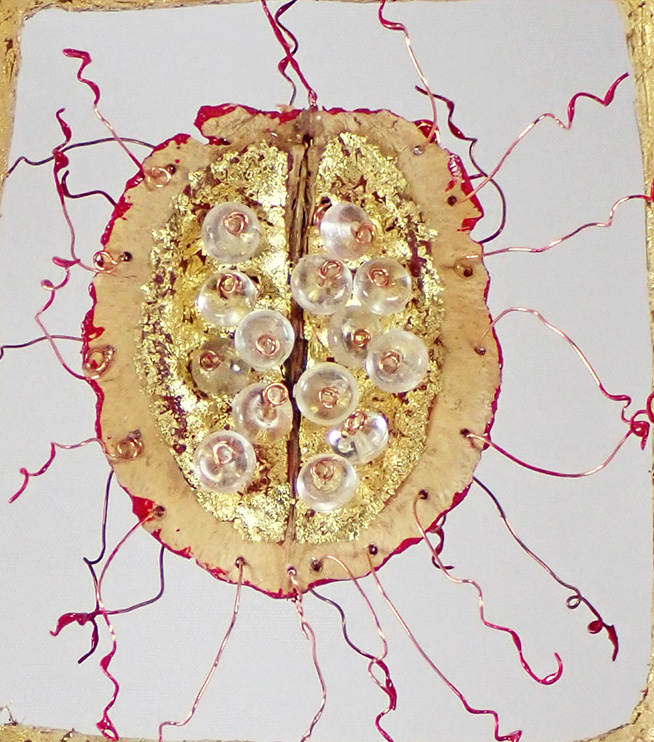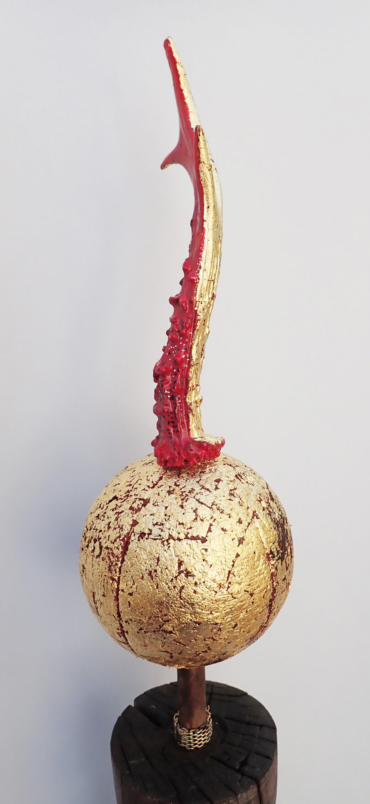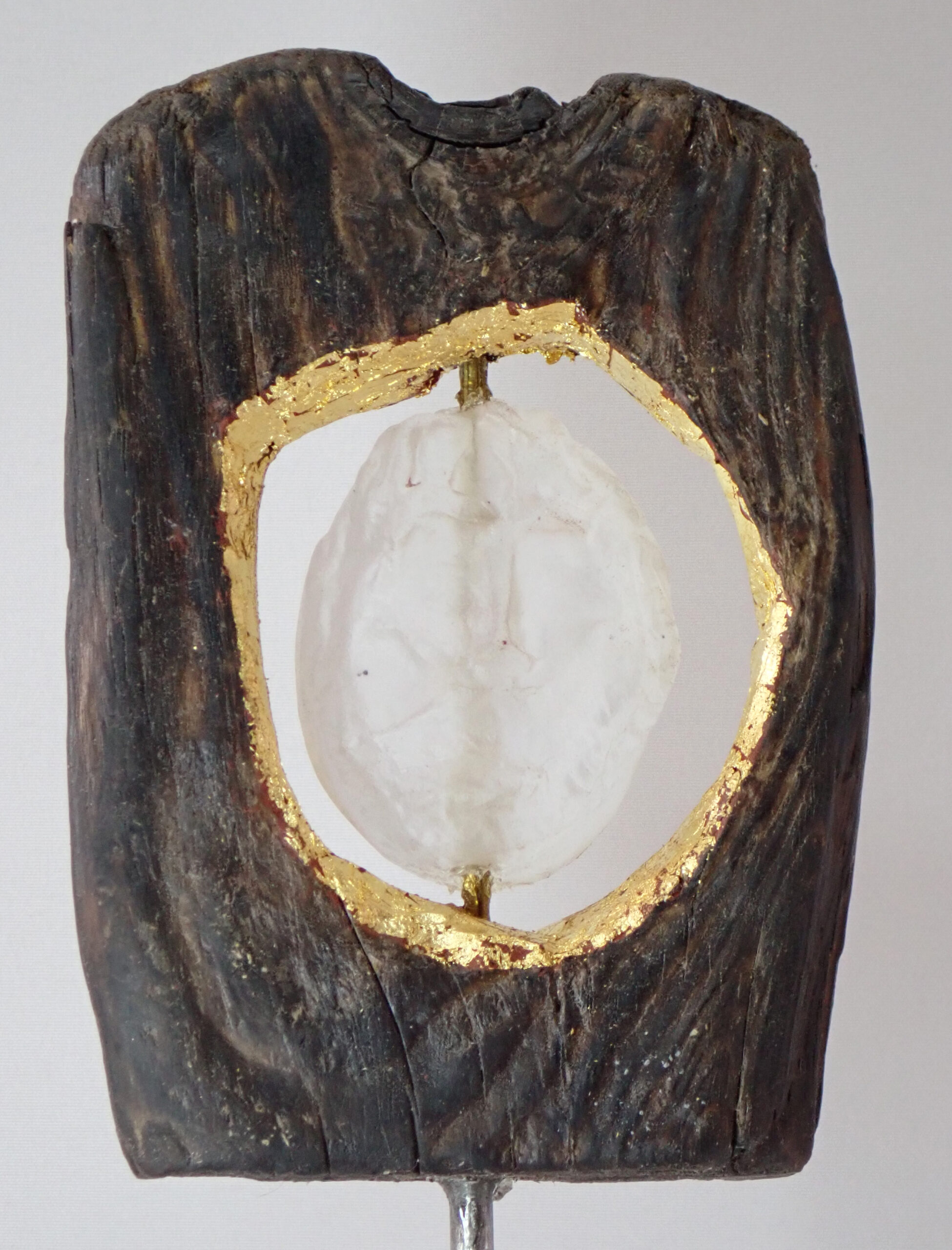 Pascale Dieleman : bois brut, brûlé, teinté, feuille d’or et éléments divers.